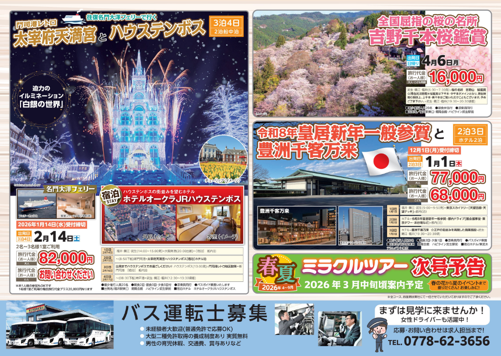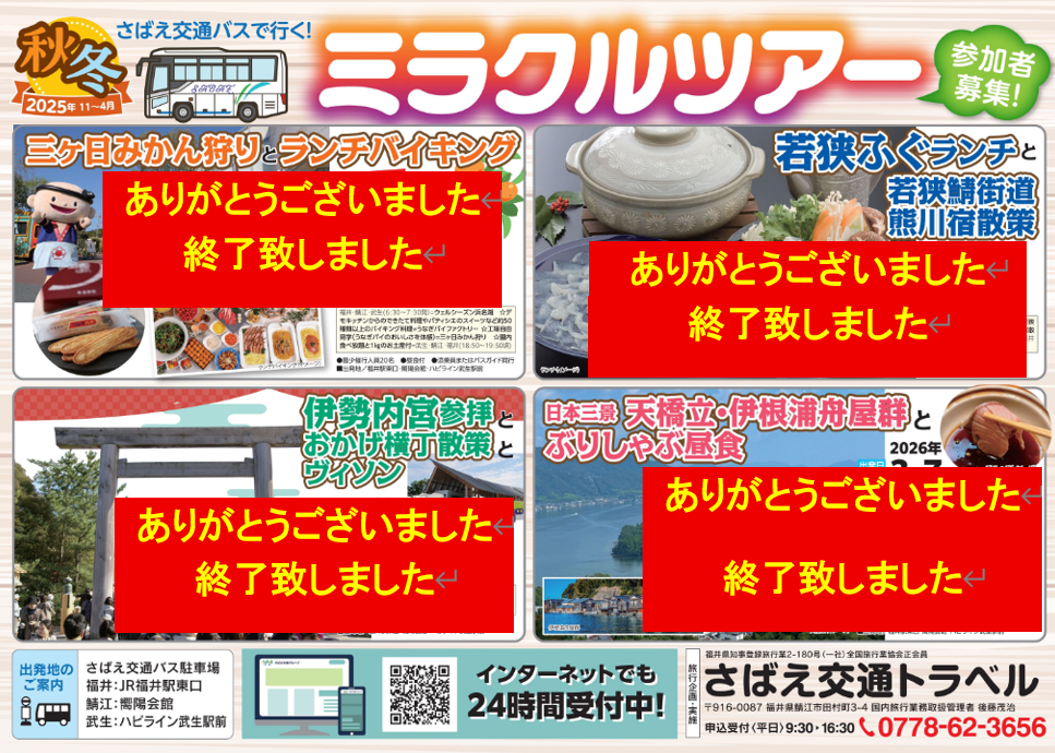日帰りから泊りがけまで、鯖江交通で行くミラクルツアーを開催しております。