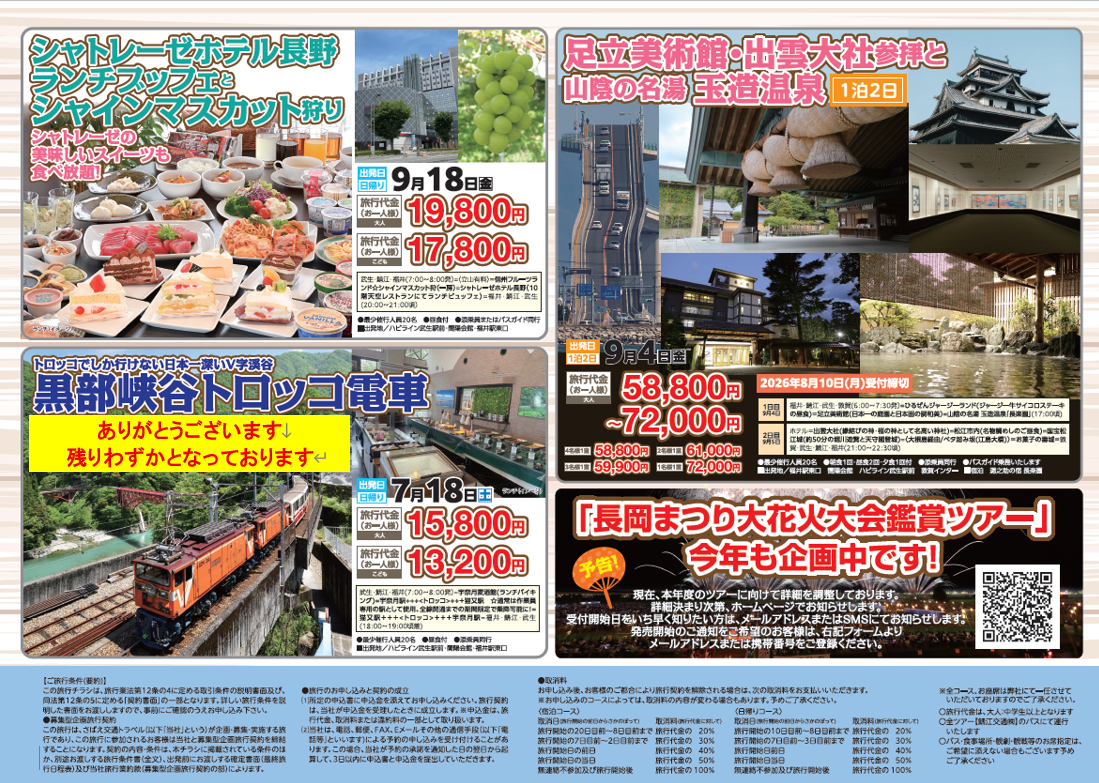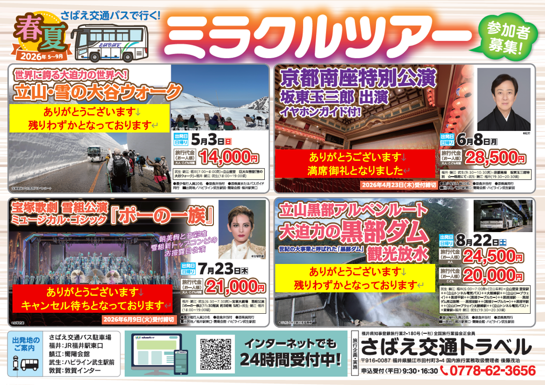 日帰りから泊りがけまで、鯖江交通で行くミラクルツアーを開催しております。