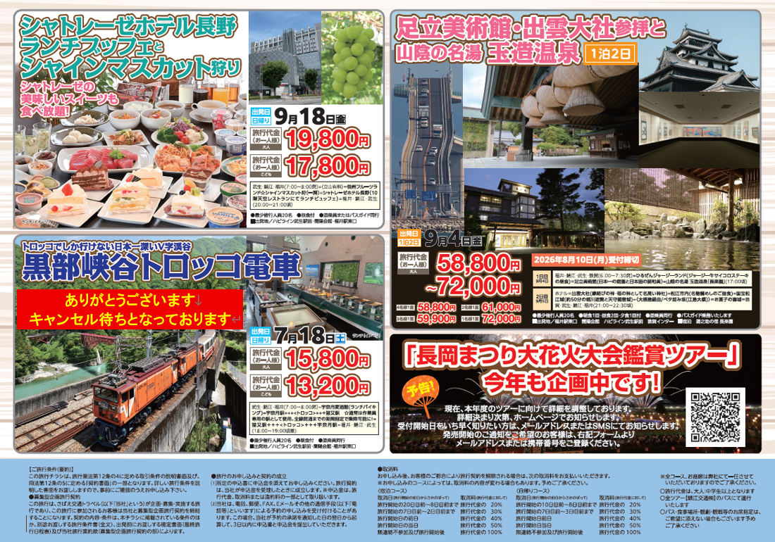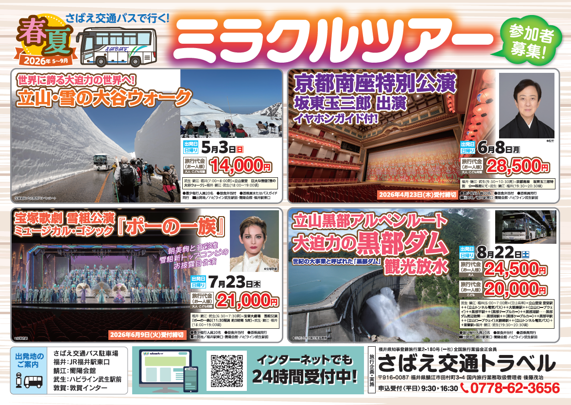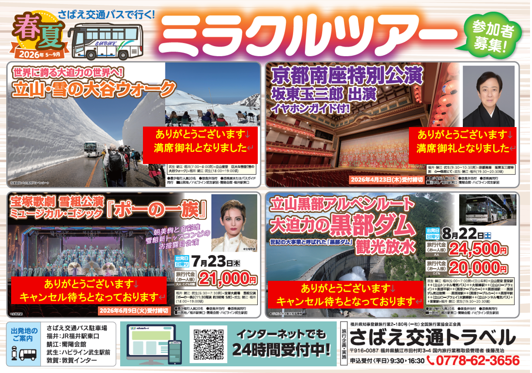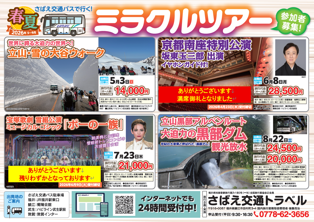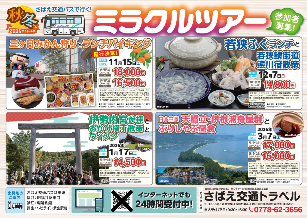 日帰りから泊りがけまで、鯖江交通で行くミラクルツアーを開催しております。
