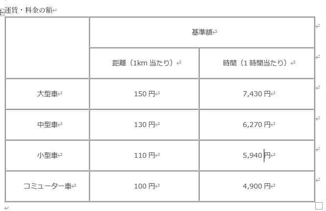運賃の種類は、時間制運賃、キロ制運賃、時間・キロ選択制運賃、行先別運賃とする。